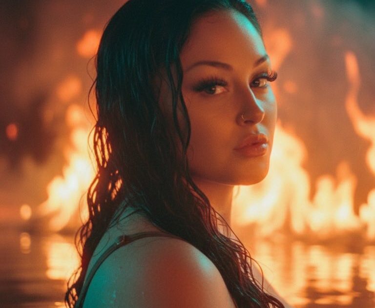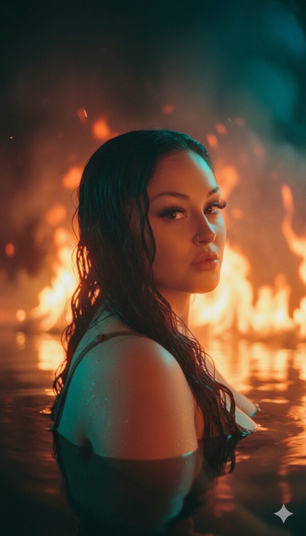 Crea un retrato en primer plano de perfil ¾ con fuerte contraste, estilo fotografía de película de 35 mm, dentro del agua hasta los hombros, usando mi mismo rostro como referencia. Mi cabello está mojado, con reflejos suaves en tonos rojos, y una expresión facial serena. El fondo tiene llamas y humo desenfocado, con un toque cinematográfico. Mi cabeza está ligeramente inclinada, como si mirara por encima del hombro hacia la cámara. La estética es intensa y misteriosa, con una paleta de colores cálidos y profundos: verdes oscuros, azules y tonos teal, con destellos fríos azulados que dan un brillo húmedo y etéreo. Mantén exactamente mis rasgos faciales y mi cabello como en la referencia.