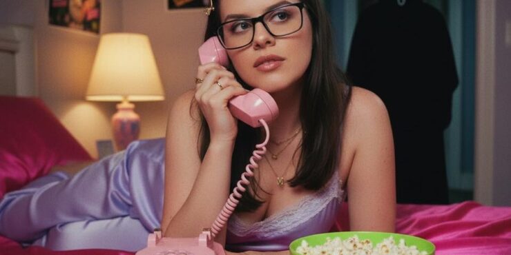 Crea una foto mía en un retrato de ensueño estilo Y2K, recostada sobre una cama con sábanas satinadas color rosa brillante. Estoy sosteniendo un gran teléfono con cable estilo noventero, en una pose pensativa y soñadora. Mi cabello es largo, negro y cae libremente en rizos sueltos, con pasadores rosas a cada lado. Llevo joyería delicada: collares dorados finos, accesorios y anillos dorados gruesos. La habitación detrás de mí es femenina y soñadora, con pósters noventeros. Mi maquillaje es simple pero glamuroso, con brillo labial y delineador marrón. La foto tiene un estilo granulado de los 90, con una fuente de luz cálida, como la de una lámpara en una habitación tenue por la noche. Detrás de mí, el asesino de Ghostface está de pie observándome; su cuerpo está débilmente iluminado, en el marco de un pasillo oscuro y ligeramente siniestro. Mantén mis rasgos faciales sin cambios.