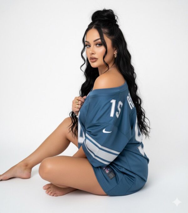 Crea una foto tipo retrato, en primer plano, de mí sentada con elegancia sobre un piso blanco, de lado, con una pierna arqueada. El fondo debe ser totalmente blanco, limpio y sin props. Llevo una camiseta oversized de los Detroit Lions, con hombros descubiertos y mangas cortas caídas. Estoy mirando a la cámara con una expresión seductora. Mi cabello está recogido en un chongo despeinado con dos mechones sueltos al frente. El maquillaje es simple pero glamuroso, con brillo labial café y delineador marrón. Agrega joyería delicada: collares y aretes dorados finos, y anillos dorados gruesos. No llevo zapatos ni calcetas. La foto debe tener un ligero desenfoque y parecer tomada en un estudio oscuro con flash. Mi mano derecha sujeta ligeramente la camiseta, mientras estoy en un ángulo de 45°, enfocando el lado izquierdo de mi rostro. Mi cabello está semi recogido, con ondas suaves en forma de “S”, definidas pero naturales. Mantén mi rostro sin cambios.