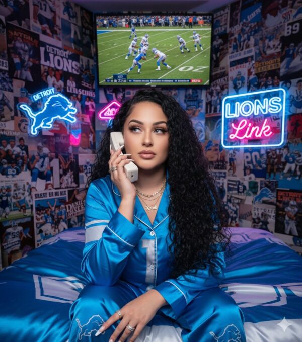 De fondo hay una TV gigante mostrando un partido de los Lions, paredes llenas de pósters vintage del equipo y luces de neón que iluminan el cuarto. La escena debe verse brillante, glossy, surreal y empapada en nostalgia Y2K.