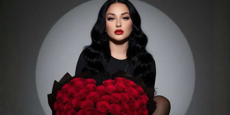 Reinventa esta foto en un retrato glamuroso y romántico de estudio, con una mujer posando con confianza. Tiene el cabello largo, oscuro y con ondas voluminosas, partido a la mitad, y un maquillaje dramático con labios intensos y pestañas marcadas. Lleva un top oscuro minimalista y unas mallas ajustadas del mismo tono. Su brazo derecho la sostiene mientras se inclina hacia atrás, con las piernas dobladas. Frente a ella hay un enorme ramo en forma de corazón hecho de rosas rojas vibrantes, envueltas en papel negro. La iluminación es dramática, con un halo de luz circular que la ilumina a ella y el área a su alrededor, sobre un fondo gris medio liso, creando una atmósfera lujosa y seductora.