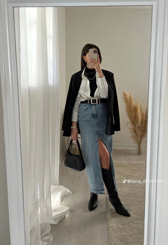 Falda larga, blusa de cuello debajo de una camisa blanca y tu blazer.