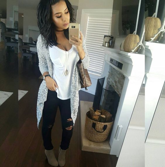Los cardigans grises no pueden faltar en tu armario. Siempre ayudan a dar el balance perfecto a la combinación de tus jeans con el color de playera que elijas.