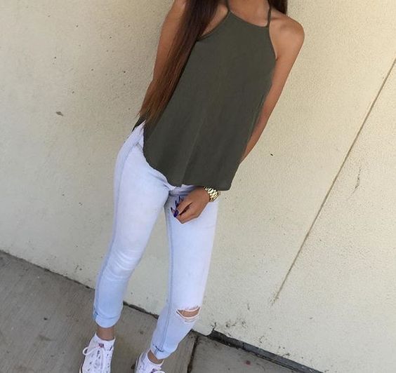 ¡No temas usar pantalones blancos! Combinados con verde militar siempre se verán de diez.