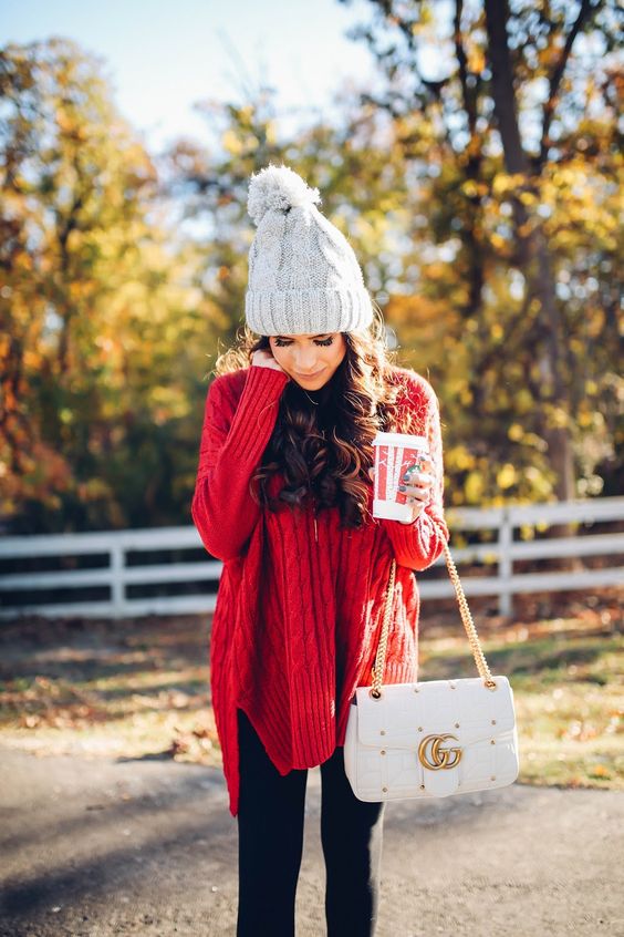 Si en tu ciudad el frío está con todo, dale un toque cute a tu hoodie, cardigan o suéter rojo con un gorro blanco o gris.