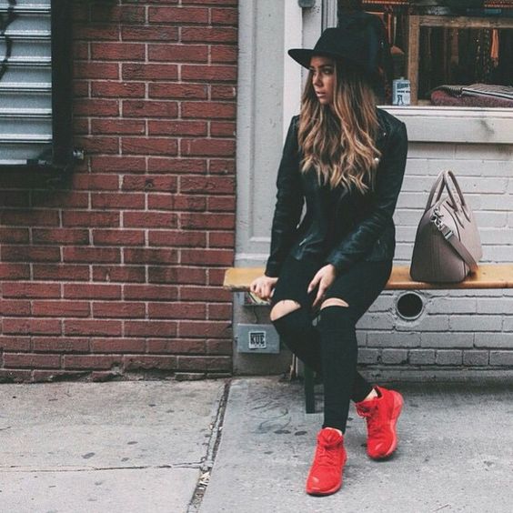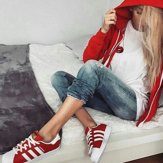 Combinar el color de la playera o sudadera con el mismo de los tenis siempre es una excelente idea. Este look lo puedes hacer con pantalones negros, blancos o de mezclilla ¡y te verás increíble!