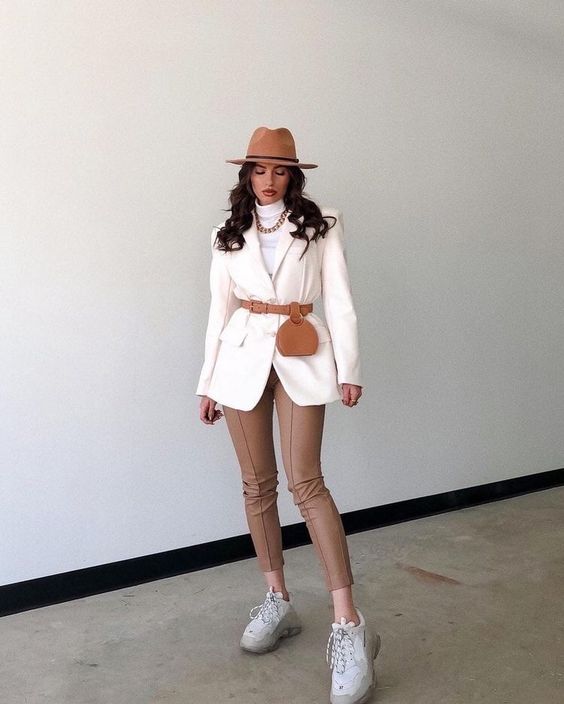 Leggings gruesos, blusa de cuello, blazer y sombrerito.