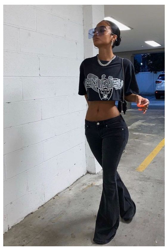 Jeans acampanados y a la cadera.