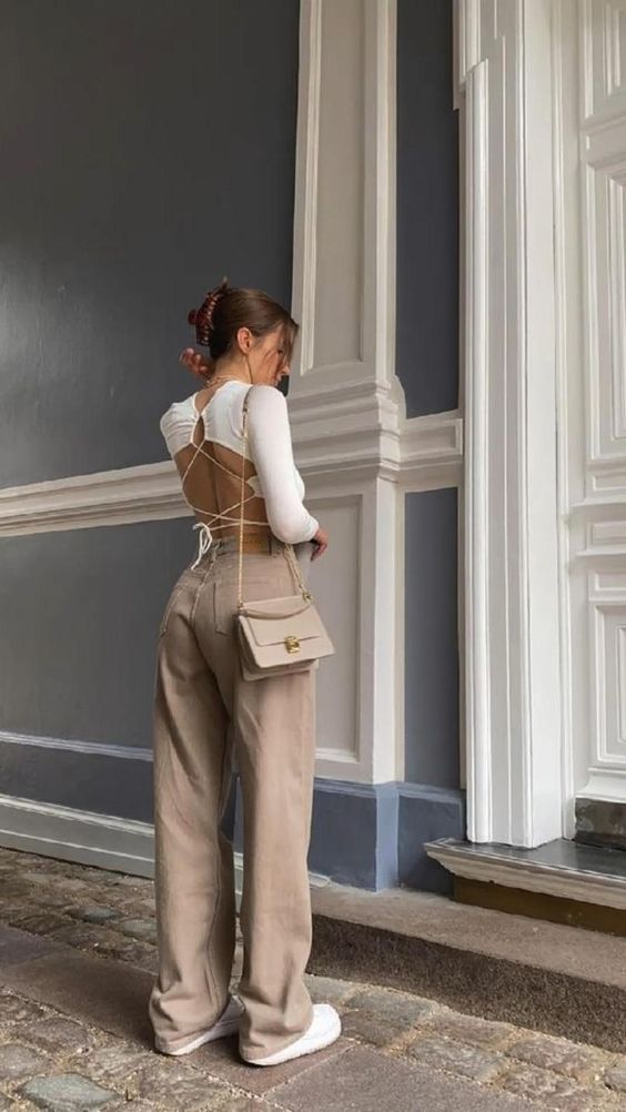 Un conjunto en tonos neutros y con estampados pequeños.