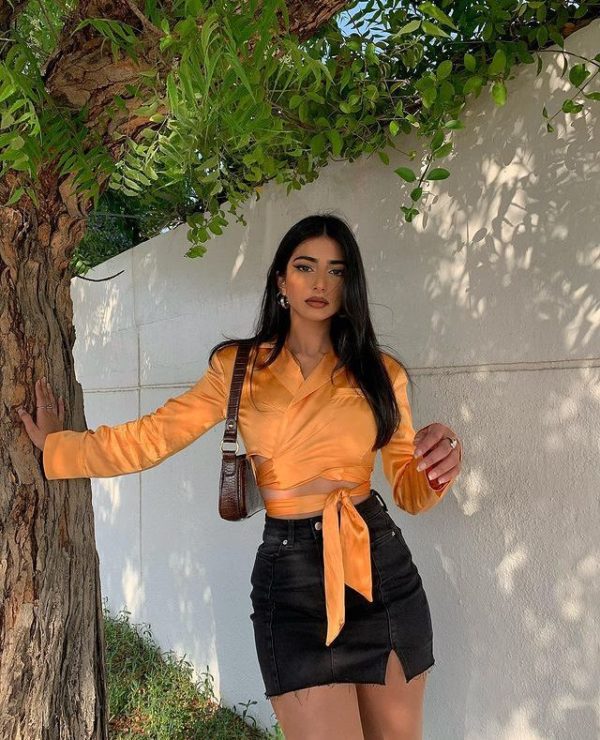 Destaca en el antro con una minifalda y camisa slip de manga larga color vibrante.