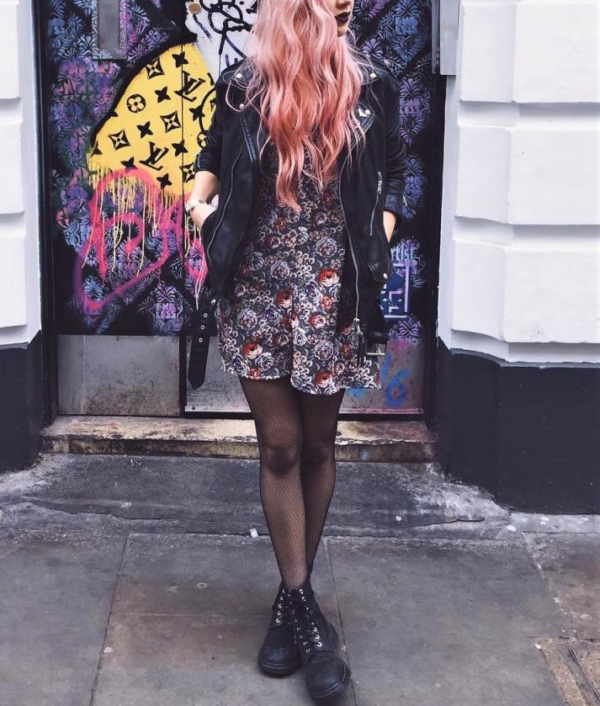 Un vestido floreado como los que regalan las tías, con una chaqueta de cuero, medias y botas.
