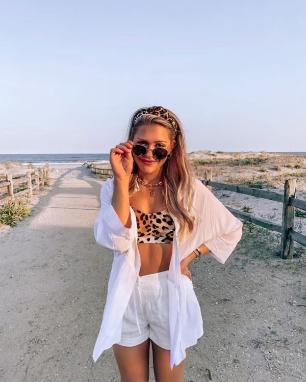 Conjunto blanco de short y saco, así resaltas la parte alta de tu bikini y estás lista para salir.