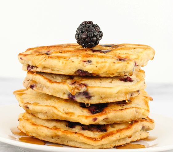 Mezcla todos los ingredientes en la licuadora o procesador (menos las moras, arándanos y frambuesas). Calienta un sartén, coloca un poco de mantequilla y vierte la mezcla formando hotcakes redondos, coloca algunas berries encima, deja cocinar por unos minutos, dale la vuelta y espera a que estén 100% cocinados.