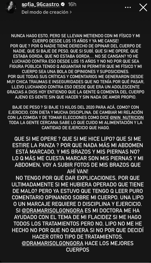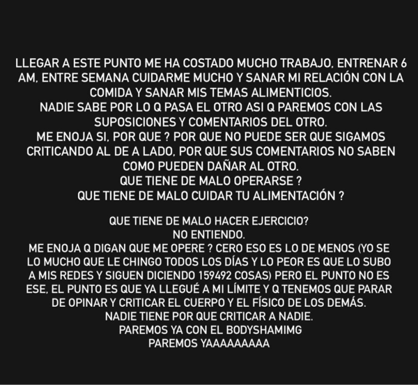 Y harta de esas críticas sin sentido, emitió su sentir mediante su stories en Instagram, diciendo que estaba harta de que opinaran sobre su cuerpo y que ella lleva muchos años trabajándolo con esfuerzo, dedicación y constancia. ¡Y vaya que se nota que eso es cierto!