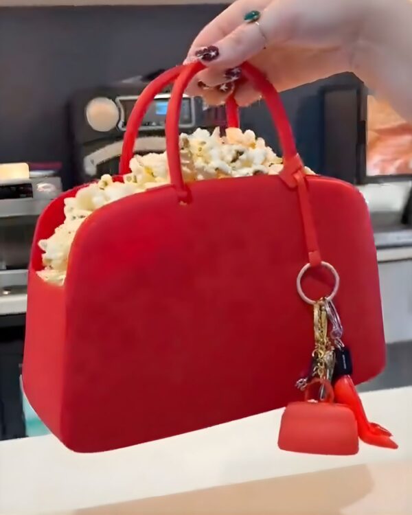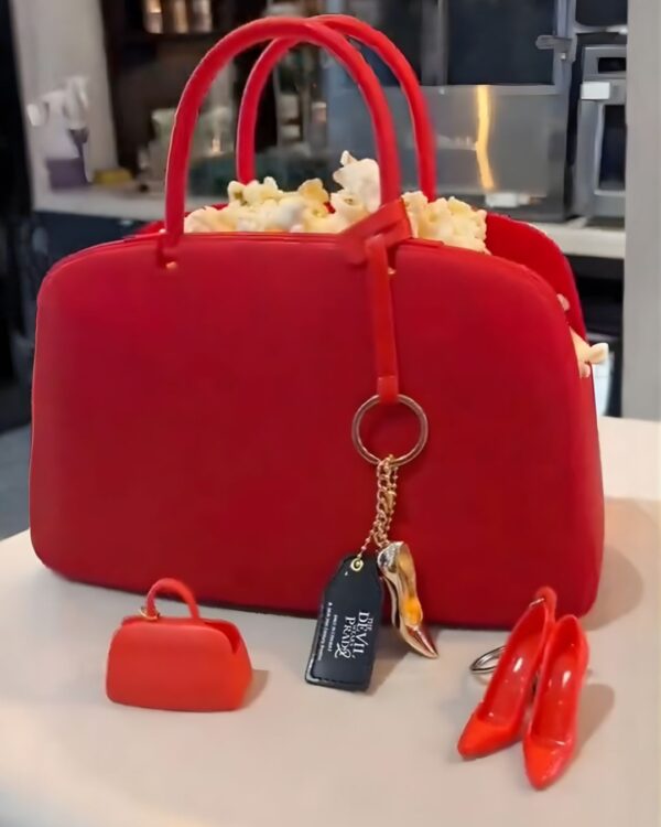 Es un bolso rojo elegante con asas, inspirado en el mundo de la moda de la película. Dentro lleva las palomitas, pero por fuera parece un accesorio digno de pasarela.
