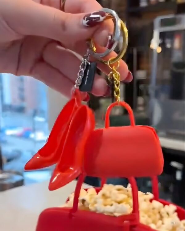 palomitas grandes, diseño de bolso rojo, detalles tipo llavero y estilo fashion